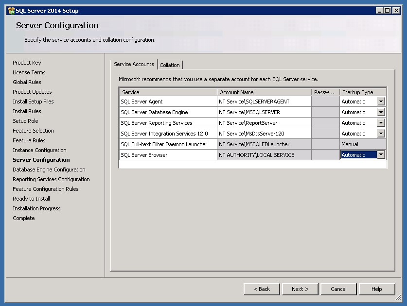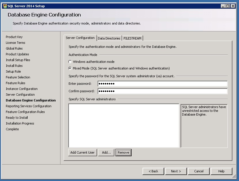 Here you can select the authentication mode for the SQL server. If you select Mixed mode, you can enter the sa account password – Don’t forget to write it down!